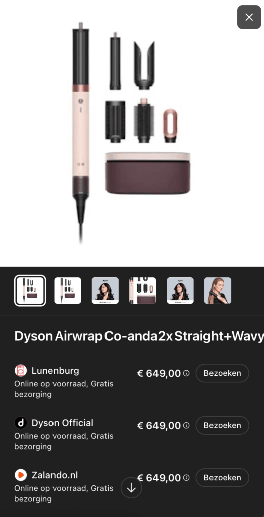 Een belangrijke ontwikkeling in ChatGPT is productvertoning. Hoe werkt dat precies? Stel dat je de vraag stelt: “Ik wil graag een Dyson Airwrap kopen, wat zijn de verschillende opties?” ChatGPT genereert eerst een antwoord op je vraag en toont vervolgens verschillende retailers waar je de Dyson Airwrap kunt kopen.