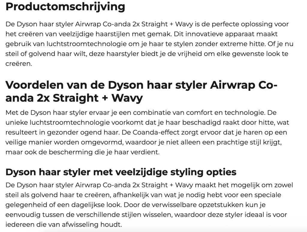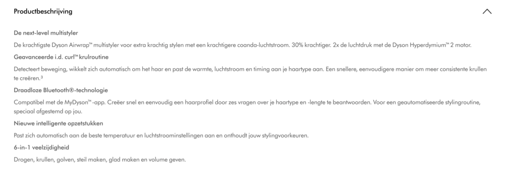 Tijdens dit onderzoek kwamen we een interessant inzicht tegen: de officiële retailer van Dyson is volgens ChatGPT niet de meest relevante bron. De partij genaamd Lunenburg kreeg de eerste positie, terwijl Dyson op nummer twee eindigde. Wanneer je in Google zoekt naar Dyson Airwrap, staat Dyson wél bovenaan.
